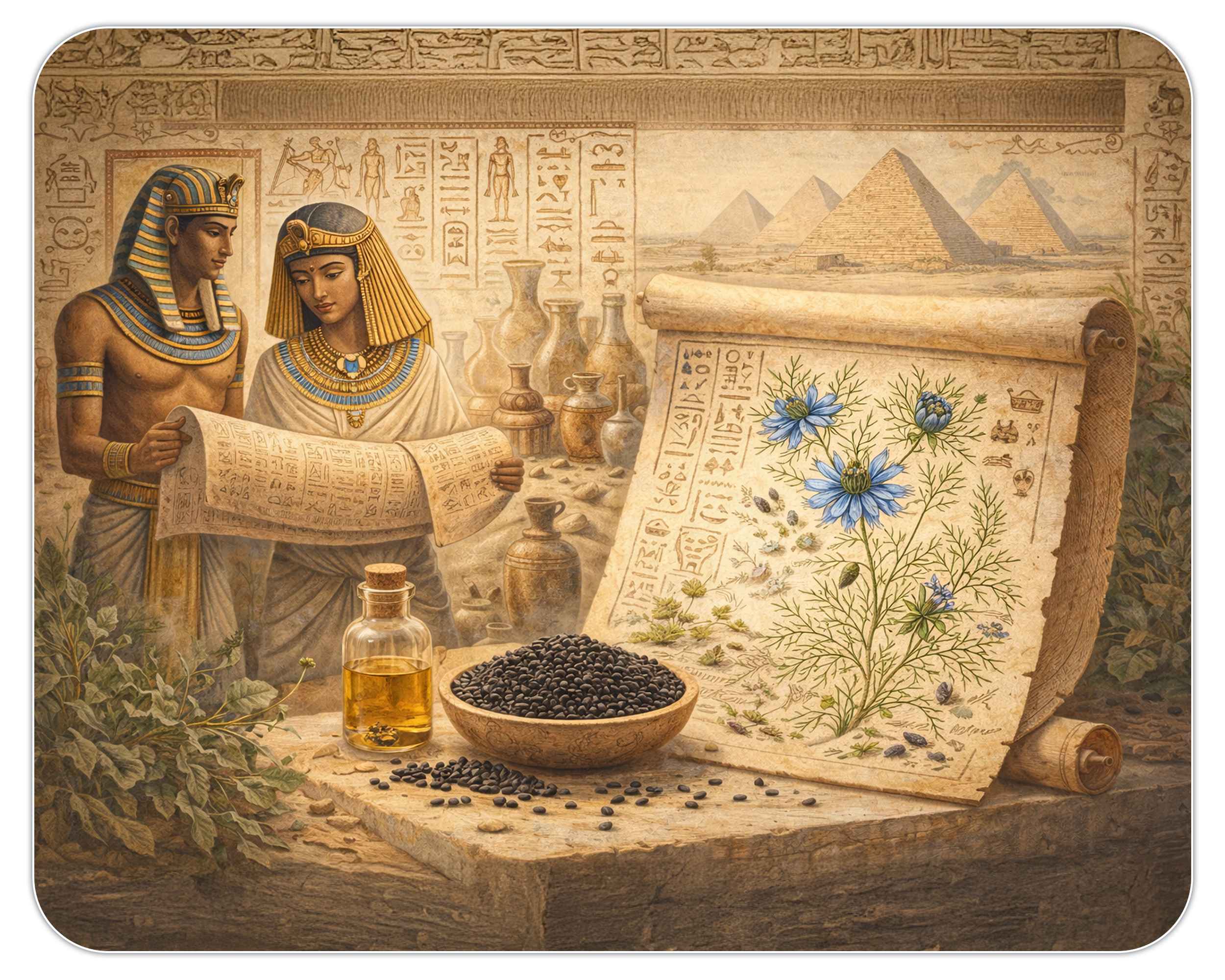Des traces de graines de Nigella sativa ont été retrouvées dans des sites archéologiques d’Égypte antique, où elle était déjà appréciée pour ses usages traditionnels liés au bien-être et à la vitalité.